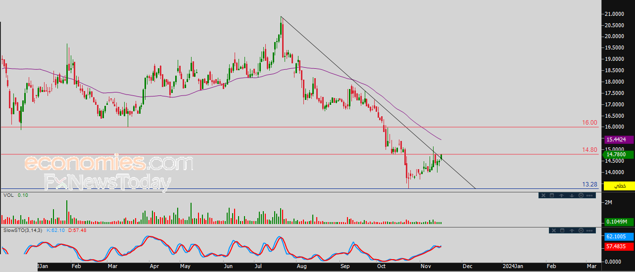 لذلك نحن نرجح عودة انخفاض السهم خلال تداولاته القادمة، طيلة ثبات المقاومة 14.80، ليستهدف من جديد مستوى الدعم 13.28.