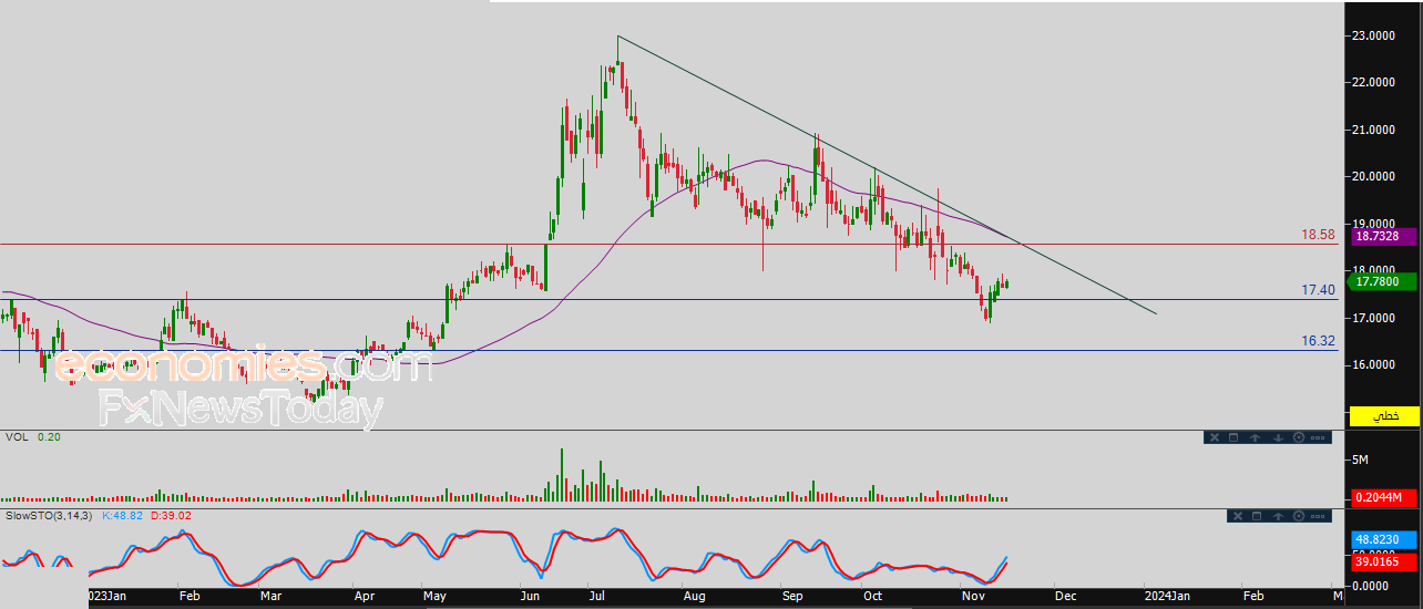 لذلك نحن نرجح عودة انخفاض السهم خلال تداولاته القادمة، طيلة ثبات المقاومة 18.58، وخاصة في حالة عودة استقراره دون مستوى الدعم 17.40، ليستهدف بعدها مستوى الدعم 16.32.