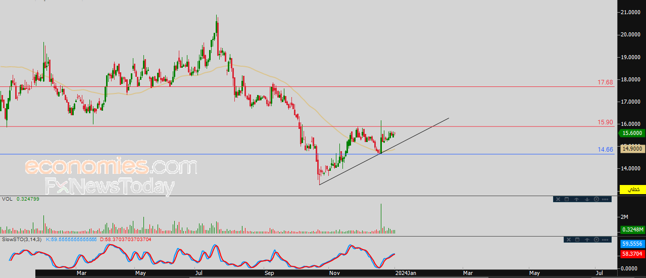 لذلك نحن نتوقع ارتفاع السهم خلال تداولاته القادمة، خاصة في حالة اختراقه للمقاومة 15.90، ليستهدف بعدها مستوى المقاومة 17.68.