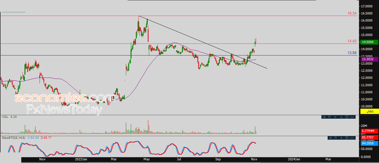لهذا نحن نتوقع ارتفاع السهم خلال تداولاته القادمة، خاصة في حالة اختراقه للمقاومة 14.40، ليستهدف مستوى المقاومة المحوري 16.34.