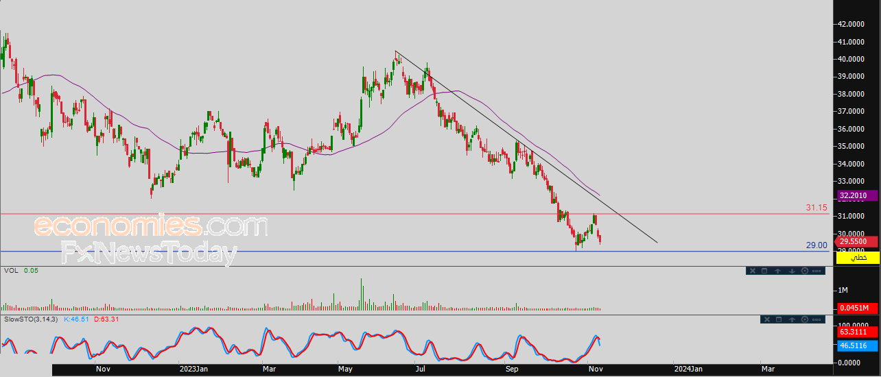 لهذا نحن نتوقع المزيد من الانخفاض للسهم خلال تداولاته القادمة، ليستهدف مستوى الدعم القريب 29.00 استعداداً لكسره.
