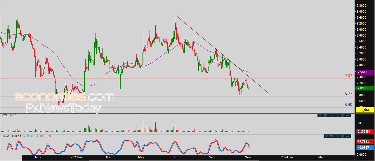 لذلك تشير توقعاتنا إلى المزيد من الانخفاض للسهم خلال تداولاته القادمة، طيلة ثبات المقاومة 7.37، ليستهدف أولى مستويات الدعم عند 6.77.