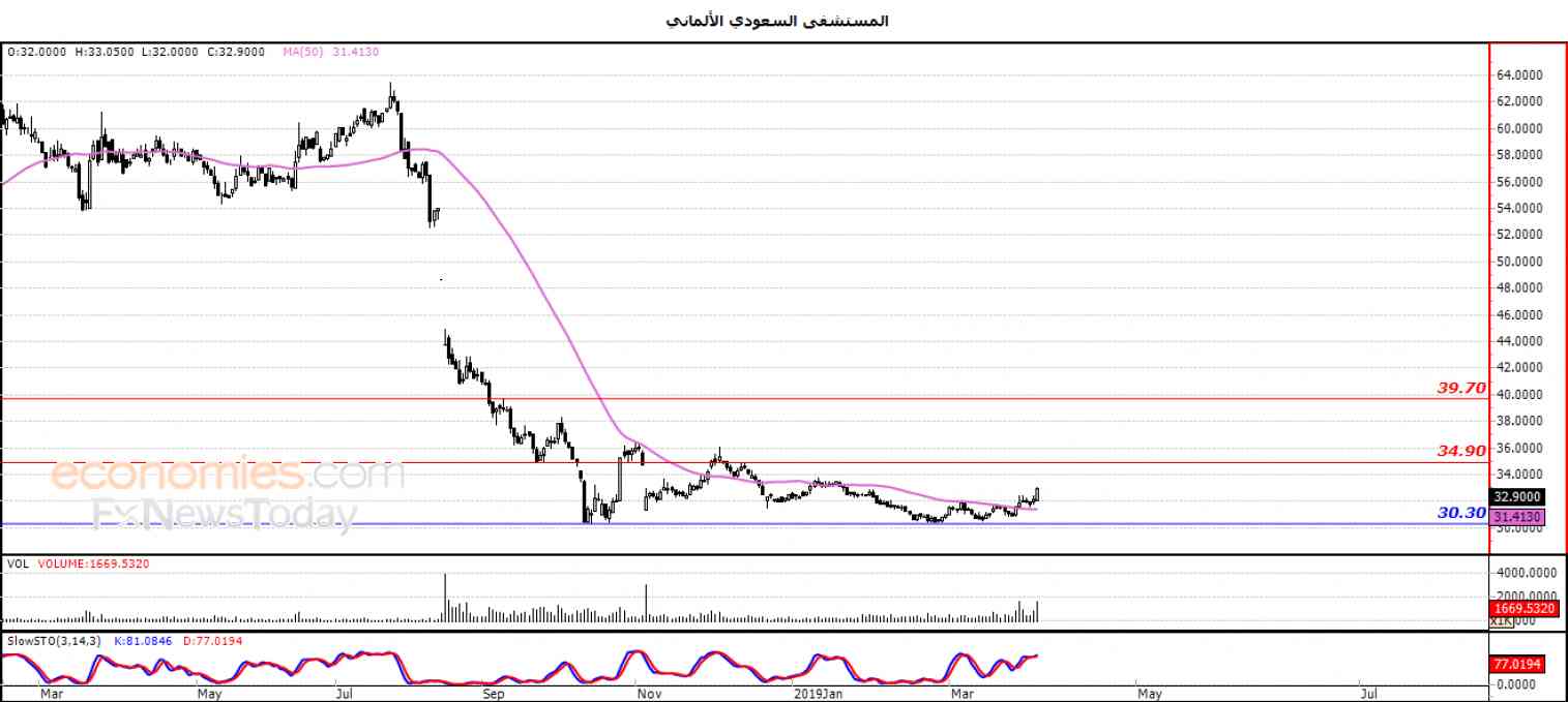 ولهذا نحن نتوقع المزيد من الارتفاع التصحيحي للسهم خلال تداولاته القادمة ، ليستهدف مستوى المقاومة 34.90 ، طيلة ثبات مستوى الدعم المحوري 30.30 .