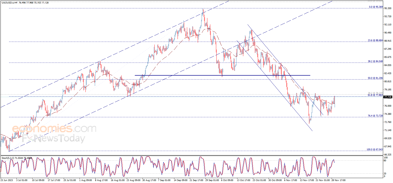 يظهر سعر النفط تداولات إيجابية ليختبر المقاومة المحورية 77.86، مما يتطلب الانتباه من التداولات القادمة، حيث إن مواصلة الارتفاع واختراق هذا المستوى سيوقف السيناريو السلبي المقترح اليوم ويقود السعر لتحقيق مزيد من المكاسب، في حين إن التماسك دونه سيضغط على السعر لاستئناف الاتجاه الهابط الذي يتواجد هدفه التالي عند 73.73.