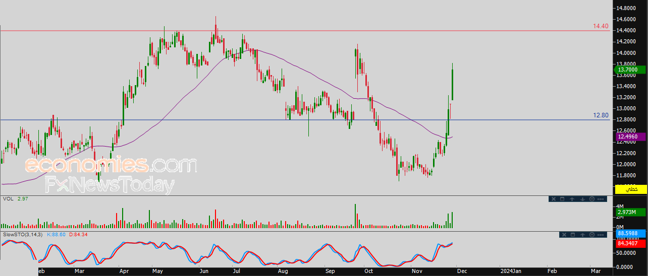لذلك نحن نتوقع استمرار صعود السهم خلال تداولاته القادمة، طيلة ثبات الدعم 12.80، ليستهدف مستوى المقاومة المحوري 14.40.