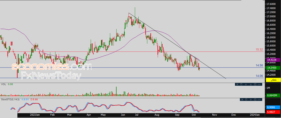 لهذا نحن نرجح عودة انخفاض السهم خلال تداولاته القادمة، خاصة في حالة كسره للدعم 14.56، ليستهدف بعدها مستوى الدعم المحوري 14.06.