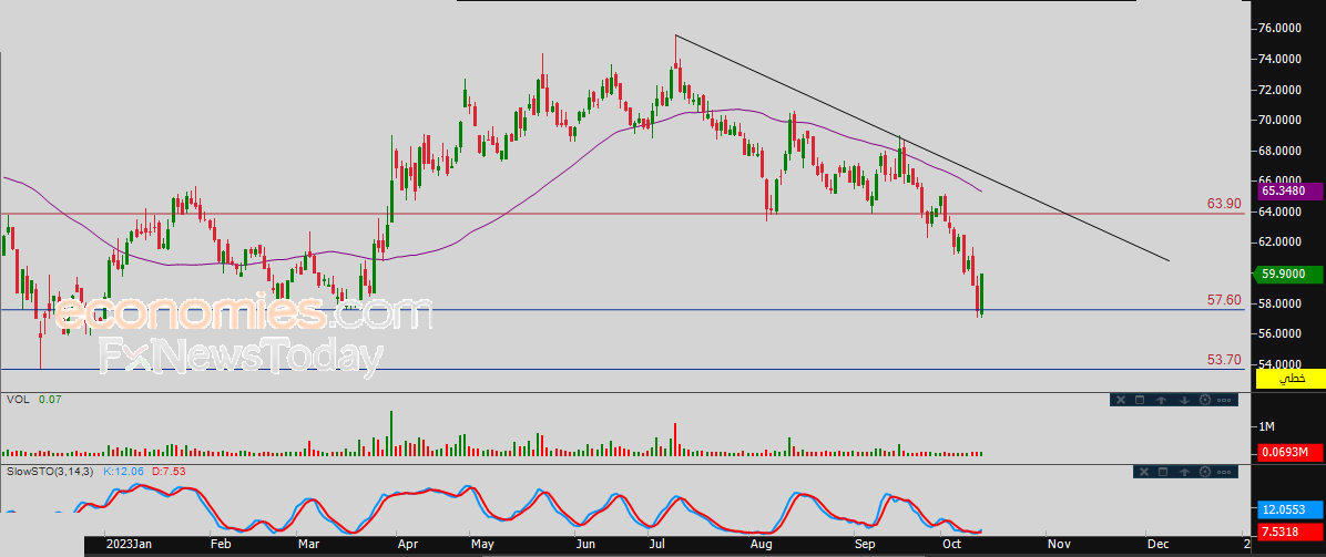 لهذا نحن نرجح عودة انخفاض السهم خلال تداولاته القادمة، طيلة ثبات المقاومة 63.90، ليستهدف من جديد مستوى الدعم 57.60 استعداداً لكسره.