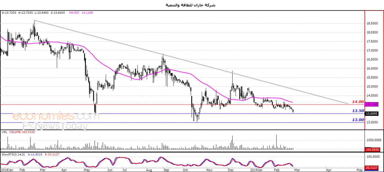 ولهذا نحن نتوقع المزيد من الانخفاض للسهم خلال تداولاته القادمة ، خاصة في حالة كسره للدعم 13.50 ، ليستهدف بعدها مستوى الدعم المحوري 13.00 .