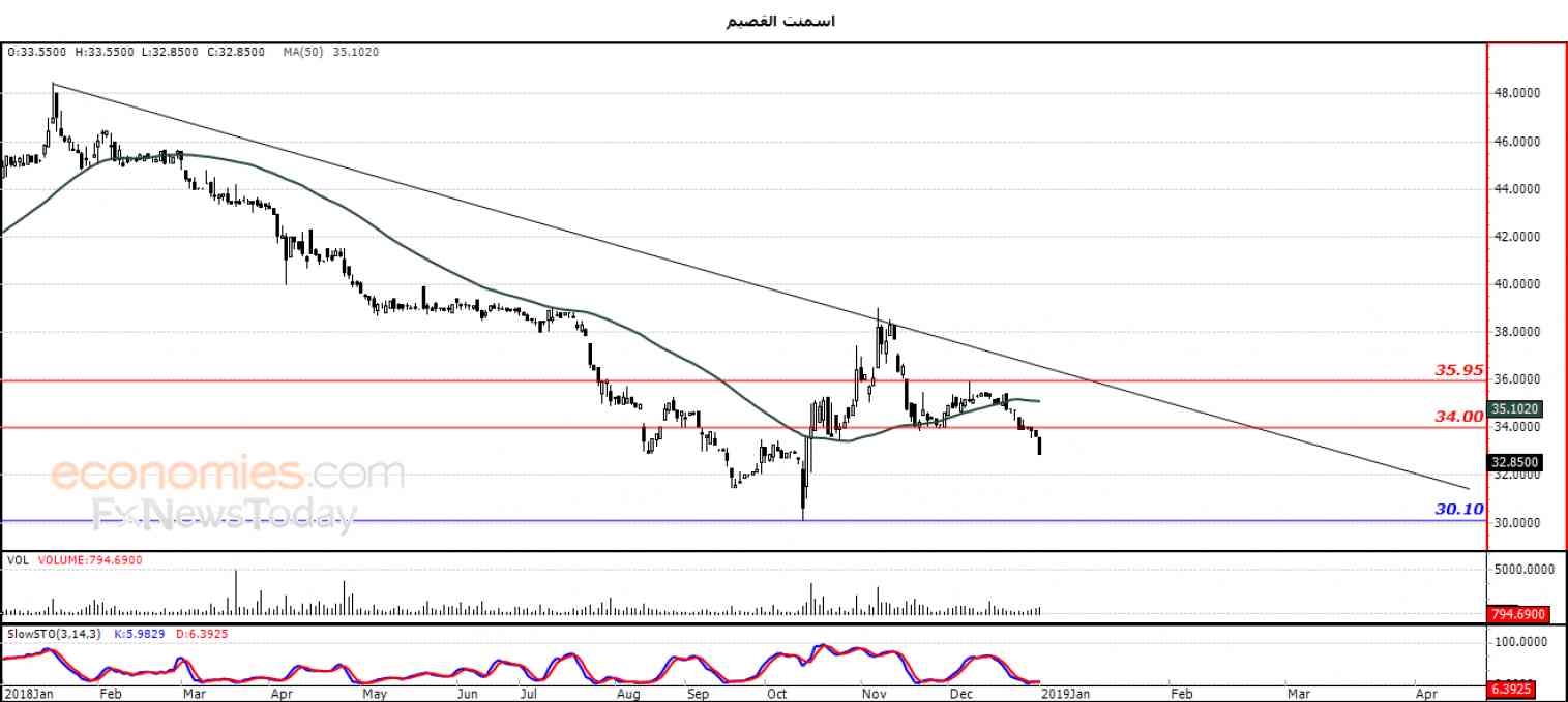 ولهذا نحن نتوقع المزيد من الانخفاض للسهم خلال تداولاته القادمة ، طيلة ثبات المقاومة 34.00 ، ليستهدف مستوى الدعم المحوري 30.10 .