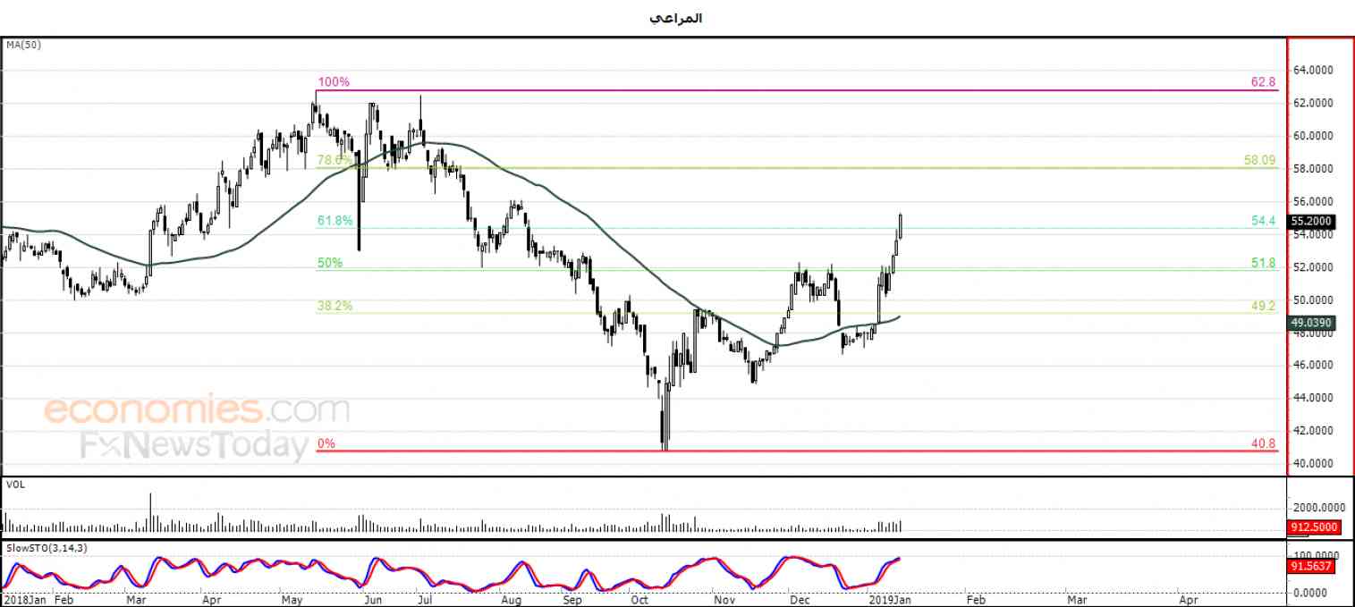 ولذلك نحن نتوقع استمرار ارتفاع السهم خلال تداولاته القادمة ، طيلة استقراره أعلى مستوى 54.40 ، ليستهدف مستوى المقاومة 58.09 الذي يمثل نسبة 78.6% من نفس المستويات التصحيحية .