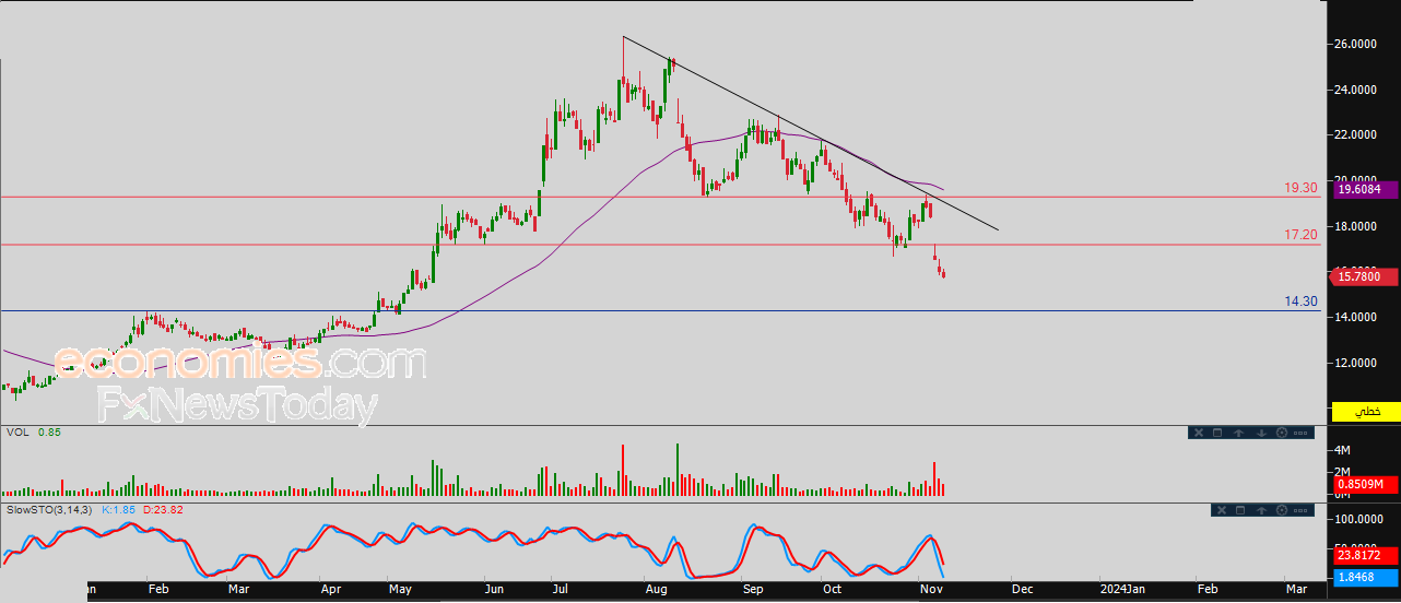 لذلك نحن نتوقع استمرار انخفاض السهم خلال تداولاته القادمة، طيلة استقراره دون مستوى المقاومة 17.20، ليستهدف مستوى الدعم 14.30.