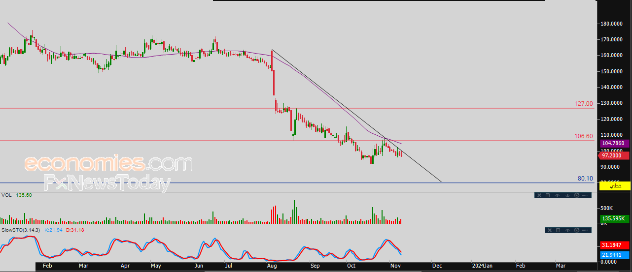 لهذا نحن نتوقع المزيد من الانخفاض للسهم خلال تداولاته القادمة، طيلة ثبات المقاومة 106.60، ليستهدف مستوى الدعم 80.10.