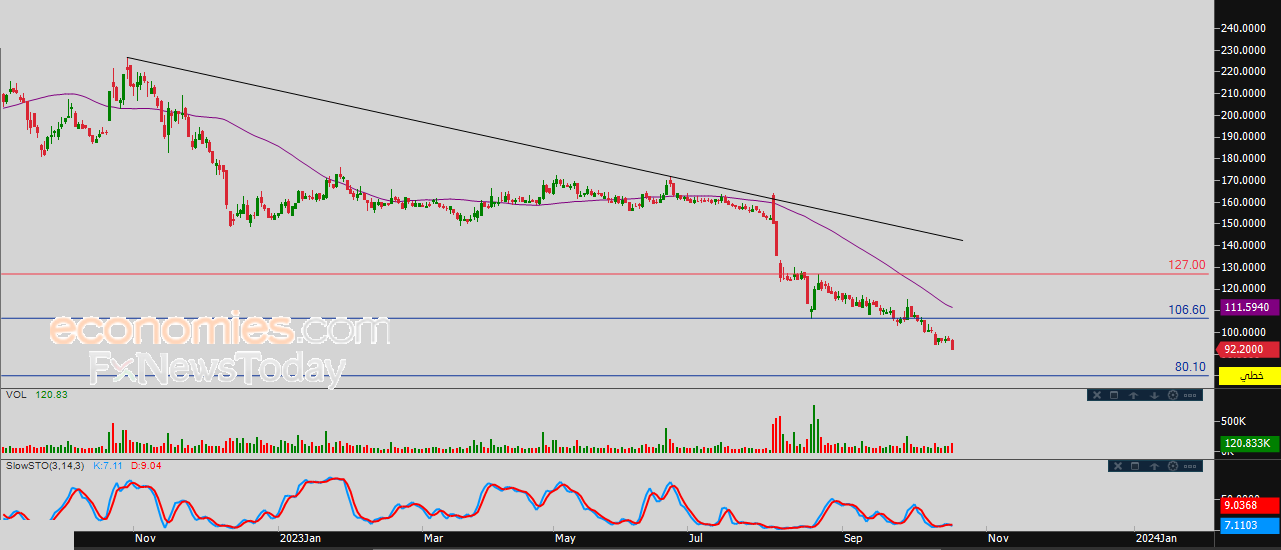 لذلك فتوقعاتنا تشير إلى المزيد من الانخفاض للسهم خلال تداولاته القادمة، طيلة استقراره دون مستوى 106.60، ليستهدف مستوى الدعم 80.00.