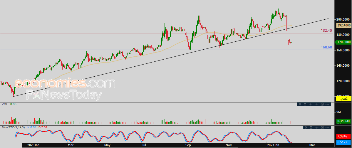 لهذا نحن نرجح عودة انخفاض السهم خلال تداولاته القادمة، طيلة استقراره دون مستوى المقاومة 182.40، ليستهدف مستوى الدعم المحوري 160.60.