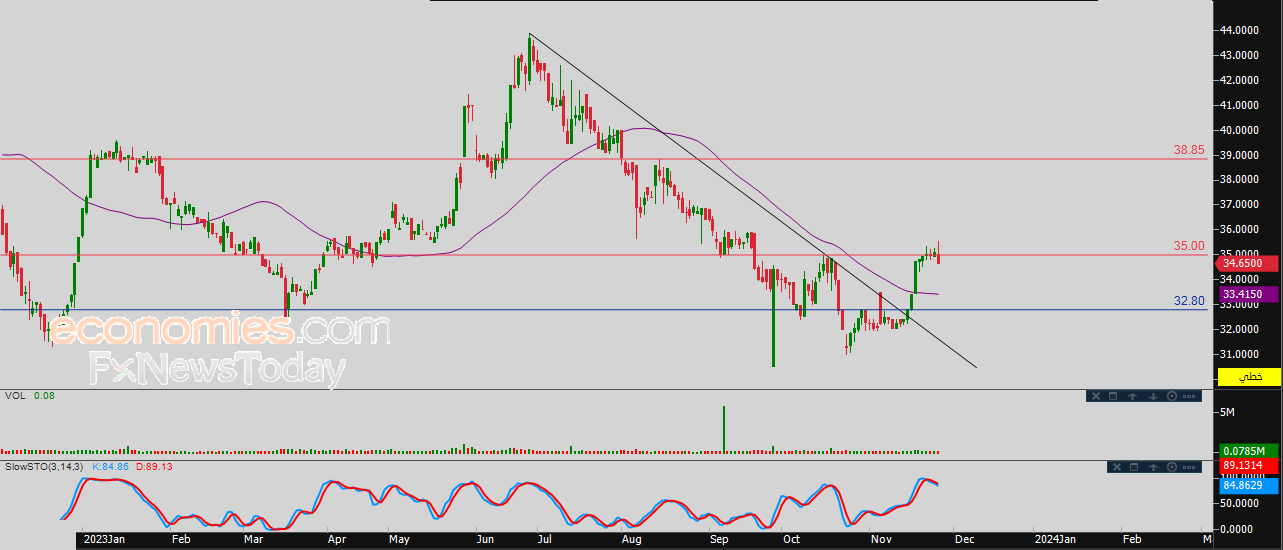 لذلك نحن نرجح عودة ارتفاع السهم خلال تداولاته القادمة، خاصة في حالة اختراقه للمقاومة 35.00، ليستهدف بعدها مستوى المقاومة 38.85.