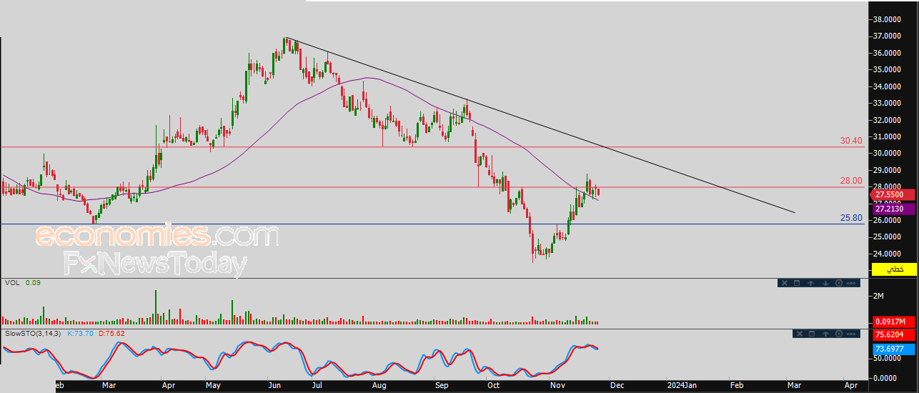 لهذا نحن نتوقع انخفاض السهم خلال تداولاته القادمة، طيلة ثبات مستوى المقاومة 28.00، ليستهدف أولى مستويات الدعم عند 25.80.