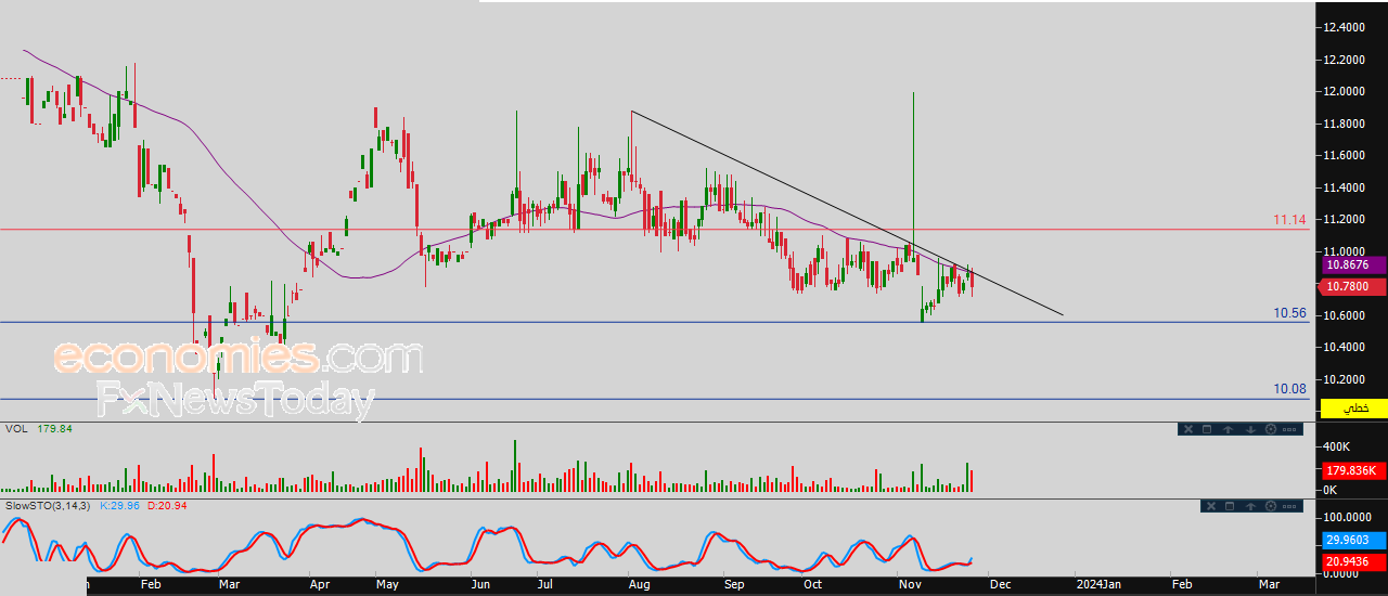 لذلك نحن نتوقع المزيد من الانخفاض للسهم خلال تداولاته القادمة، طيلة ثبات مستوى المقاومة 11.14، ليستهدف أولى مستويات الدعم عند 10.56.
