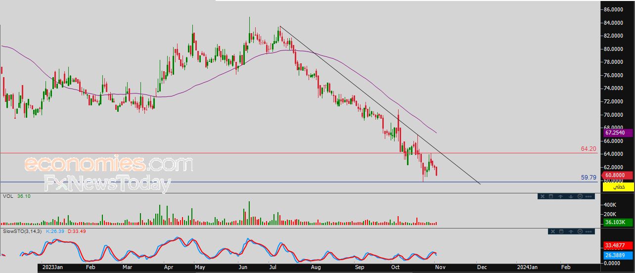 لذلك فنحن نتوقع المزيد من الانخفاض للسهم خلال تداولاته القادمة، طيلة ثبات المقاومة 64.20، ليستهدف مستوى الدعم المهم 59.80 استعداداً لكسره.