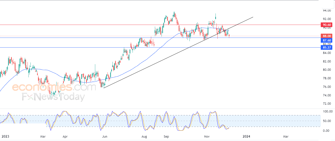 لهذا نحن نتوقع انخفاض السهم خلال تداولاته القادمة، خاصة في حالة كسره للدعم 87.60، ليستهدف بعدها مستوى الدعم 85.27.