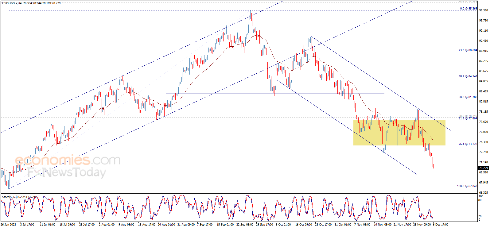 استأنف سعر النفط تداولاته السلبية بشكل قوي ليصل إلى هدفنا الجديد المنتظر عند 70.00، ونتوقّع استمرار الميل الهابط لتخطّي هذا المستوى وفتح الطريق أمام الاندفاع نحو 67.04 كمحطة رئيسية تالية، مع الأخذ بعين الاعتبار أن تماسك مستوى 70.00 أمام الضغط السلبي الحالي سيوقف السيناريو السلبي ويقود السعر لبدء محاولات تعافي على المدى اللحظي.