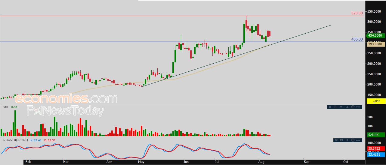 لذلك نحن نتوقع ارتفاع السهم خلال تداولاته القادمة، طيلة ثبات الدعم 405.00، ليستهدف مستوى المقاومة المحوري 528.80.