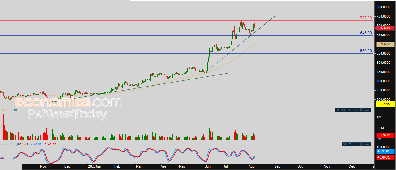 لهذا نحن نرجح عودة ارتفاع السهم خلال تداولاته القادمة، طيلة ثبات الدعم 646.00، ليستهدف من جديد مستوى المقاومة المهم 727.80 استعداداً لمهاجمته.