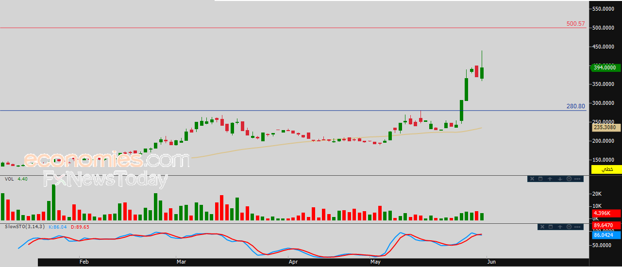 لهذا تشير توقعاتنا إلى المزيد من الصعود للسهم خلال تداولاته القادمة، طيلة ثبات الدعم 280.80، ليستهدف مستوى المقاومة 500.00.
