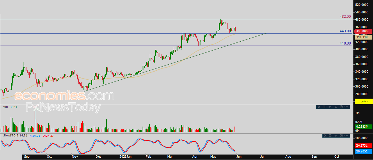 لذلك تشير توقعاتنا إلى ترجيح سيناريو عودة ارتفاع السهم خلال تداولاته القادمة، بشرط ثبات مستوى الدعم 443.00، ليستهدف مستوى المقاومة 482.00.