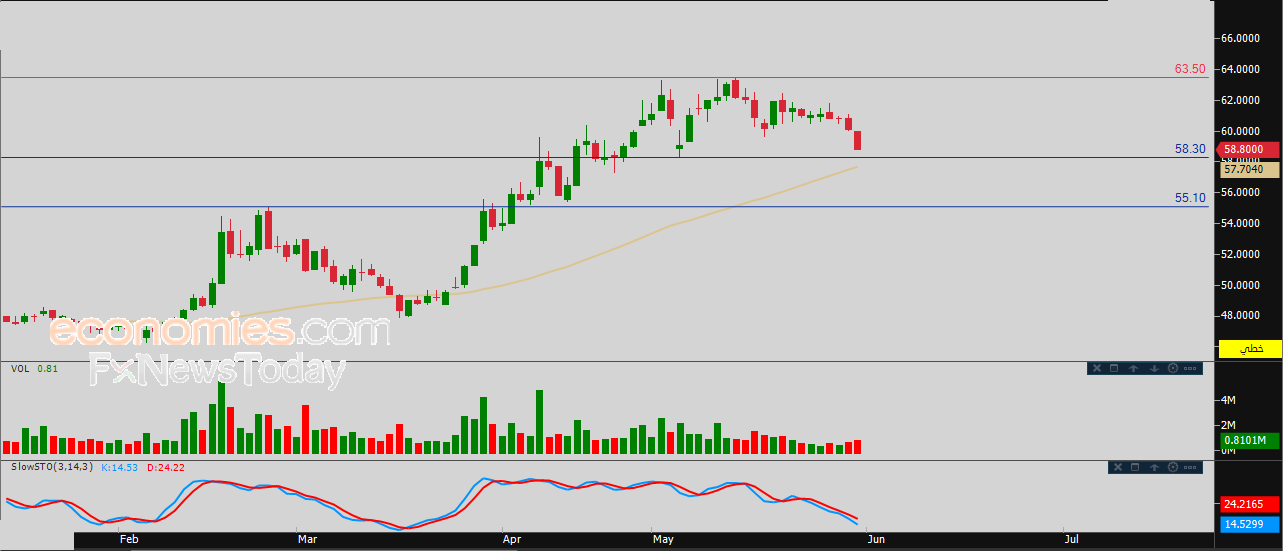 لهذا نحن نرجح عودة ارتفاع السهم خلال تداولاته القادمة، بشرط ثبات مستوى الدعم 58.30، ليستهدف مستوى المقاومة 63.50.