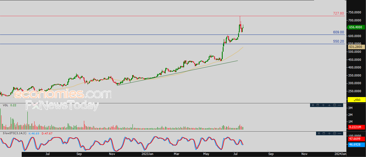 لذلك فتوقعاتنا تشير إلى المزيد من الصعود للسهم خلال تداولاته القادمة، طيلة ثبات الدعم 609.00، ليستهدف من جديد مستوى المقاومة 727.80.