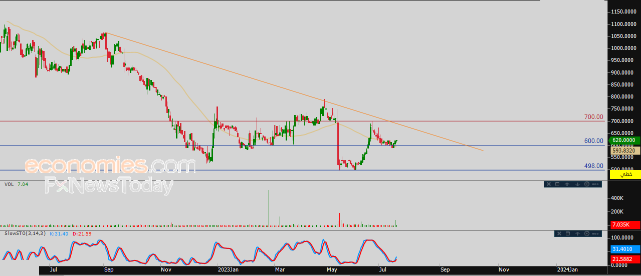 لذلك فتوقعاتنا تشير إلى المزيد من الارتفاع التصحيحي للسهم خلال تداولاته القادمة، بشرط ثبات مستوى الدعم 600.00، ليستهدف مستوى المقاومة 700.00.