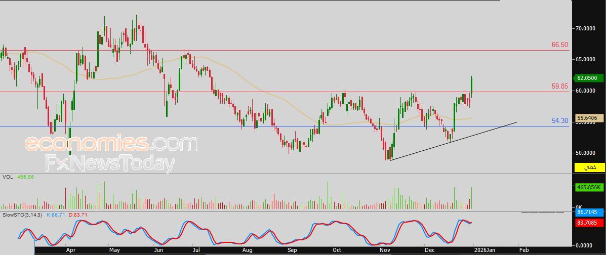 لذلك تشير توقعاتنا إلى صعود سعر السهم خلال تداولاته القادمة، خاصة طيلة استقراره أعلى سعر 59.85 ريال، ليستهدف مستوى المقاومة التالي له عند سعر 66.50 ريال.