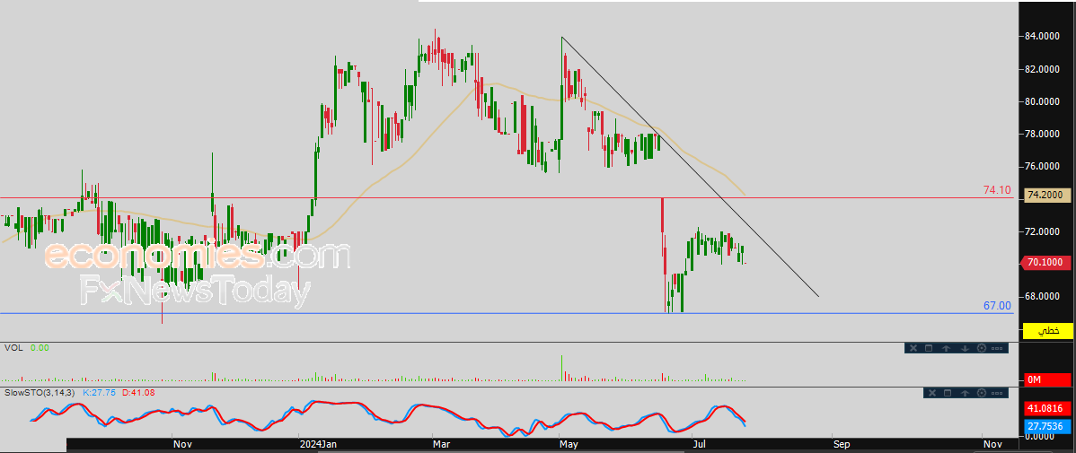 لهذا تشير توقعاتنا إلى المزيد من الهبوط لسعر السهم خلال تداولاته القادمة، طيلة ثبات مستوى المقاومة 74.10، ليستهدف مستوى الدعم المحوري 67.00.