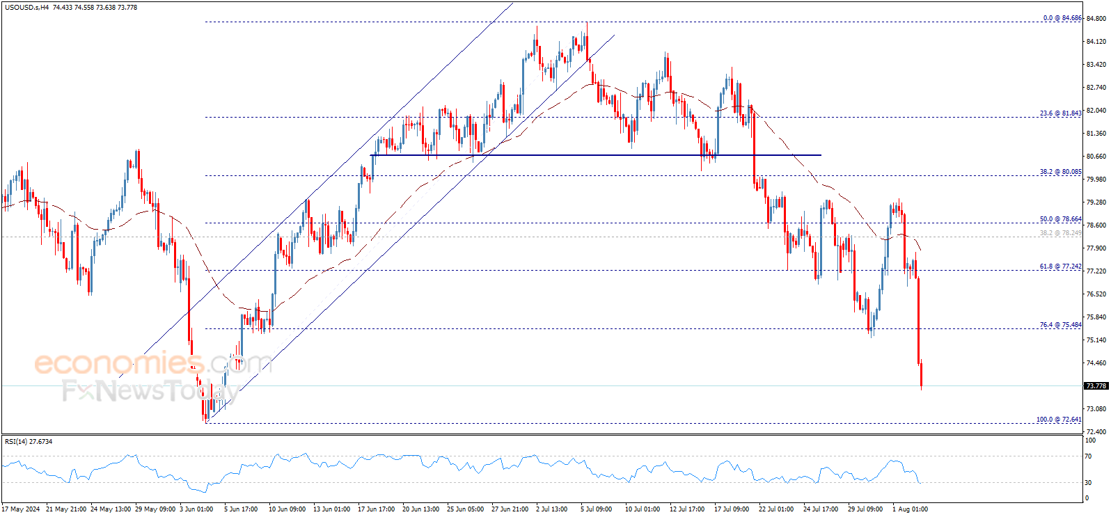 يواصل سعر النفط تكبّد الخسائر القوية ليكسر مستوى 75.48$ ويتجاوز الهدف السلبي الجديد المقترح عند 74.20$، فاتحاً الطريق أمام التوجه نحو القاع المسجّل مؤخراً عند 72.64$، بانتظار مزيد من الانخفاض المتوقع خلال الجلسات القادمة ما لم يتم اختراق مستوى 75.48$ والثبات فوقه.