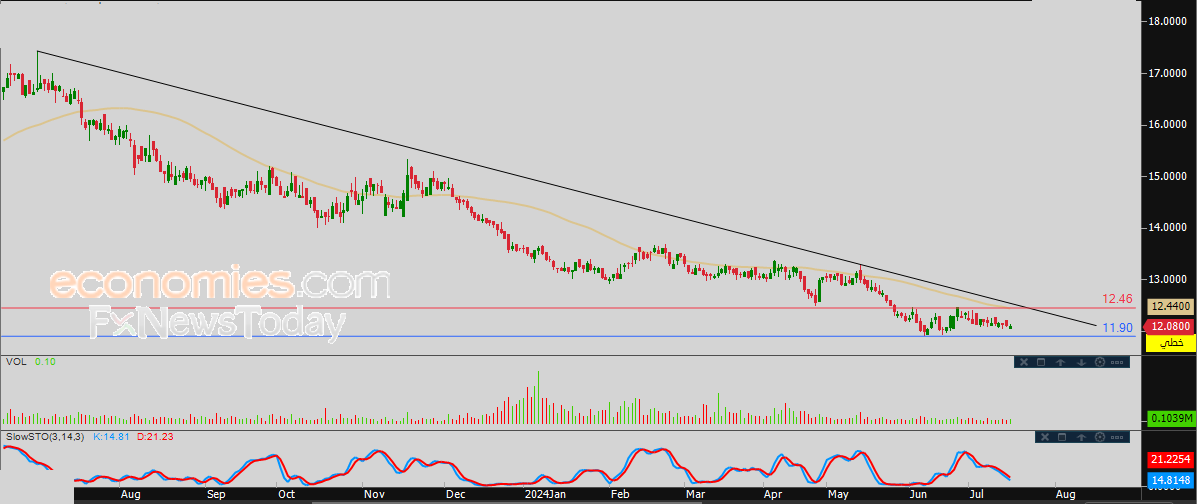 لذلك نحن نتوقع المزيد من الهبوط لسعر السهم خلال تداولاته القادمة، طيلة ثبات مستوى المقاومة 12.40، ليستهدف مستوى الدعم المهم 11.90.