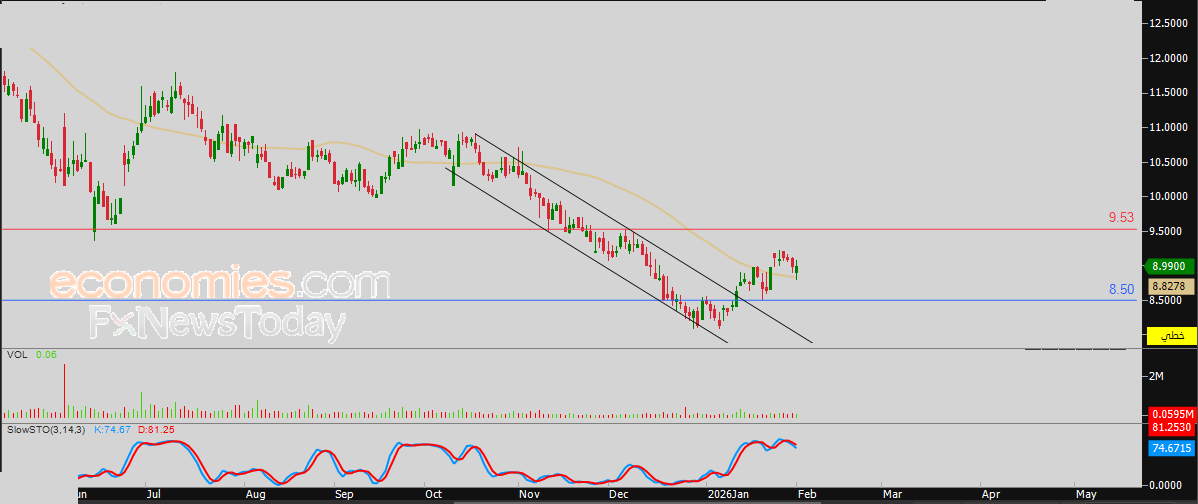 لهذا تشير توقعاتنا إلى صعود سعر السهم خلال تداولاته القادمة، طيلة ثبات مستوى الدعم 8.50 ريال، ليستهدف مستوى المقاومة المهم 9.53 ريال.