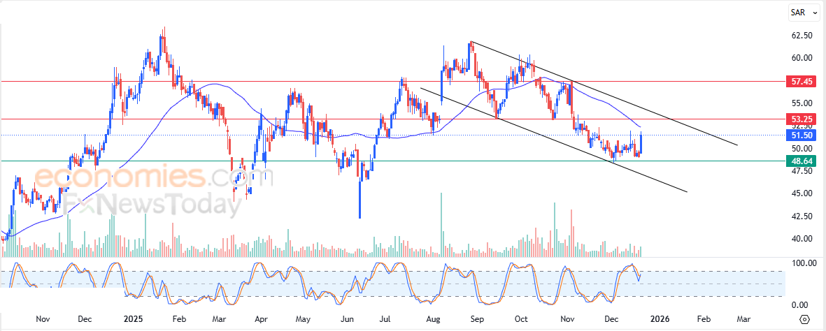 لهذا فتوقعاتنا تميل نحو هبوط سعر السهم خلال تداولاته القادمة، طيلة ثبات مستوى المقاومة 53.25 ريال، ليستهدف مستوى الدعم 48.65 ريال.