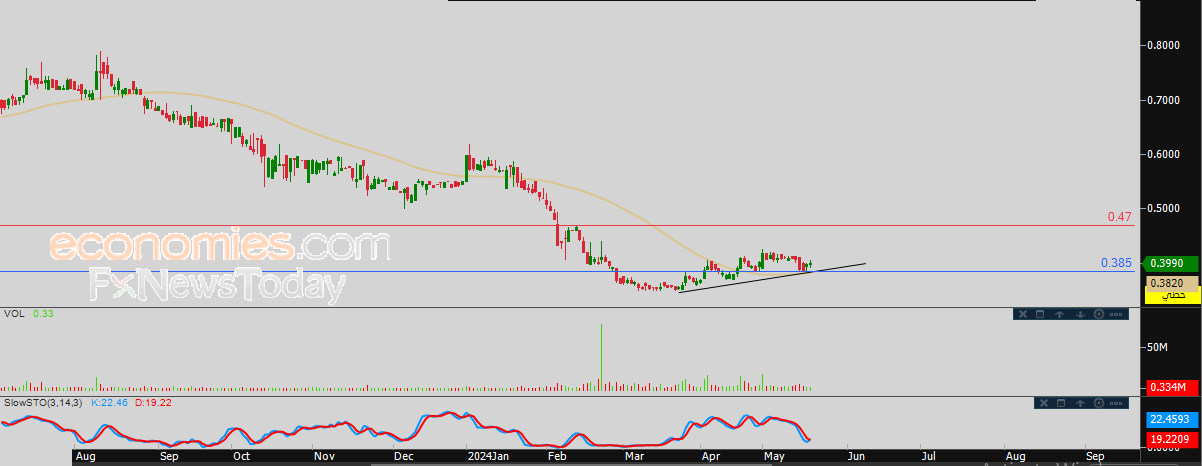 لذلك نحن نتوقع المزيد من الصعود لسعر السهم خلال تداولاته القادمة، بشرط ثبات مستوى الدعم 0.385، ليستهدف مستوى المقاومة 0.47.