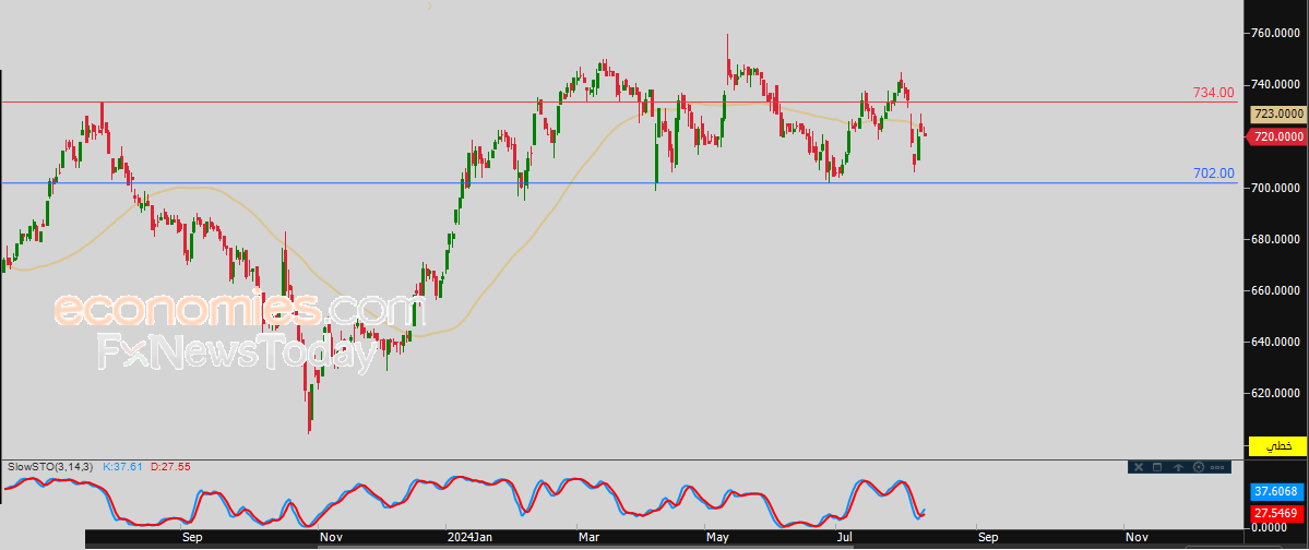 لذلك نحن نتوقع المزيد من الهبوط لسعر السهم خلال تداولاته القادمة، طيلة ثبات مستوى المقاومة 734.00، ليستهدف مستوى الدعم المحوري 702.00.
