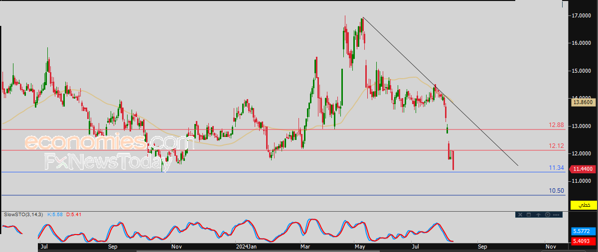 لذلك نحن نتوقع المزيد من الهبوط لسعر السهم خلال تداولاته القادمة، خاصة في حالة كسره للدعم 11.34، ليستهدف بعدها مستوى الدعم 10.50.