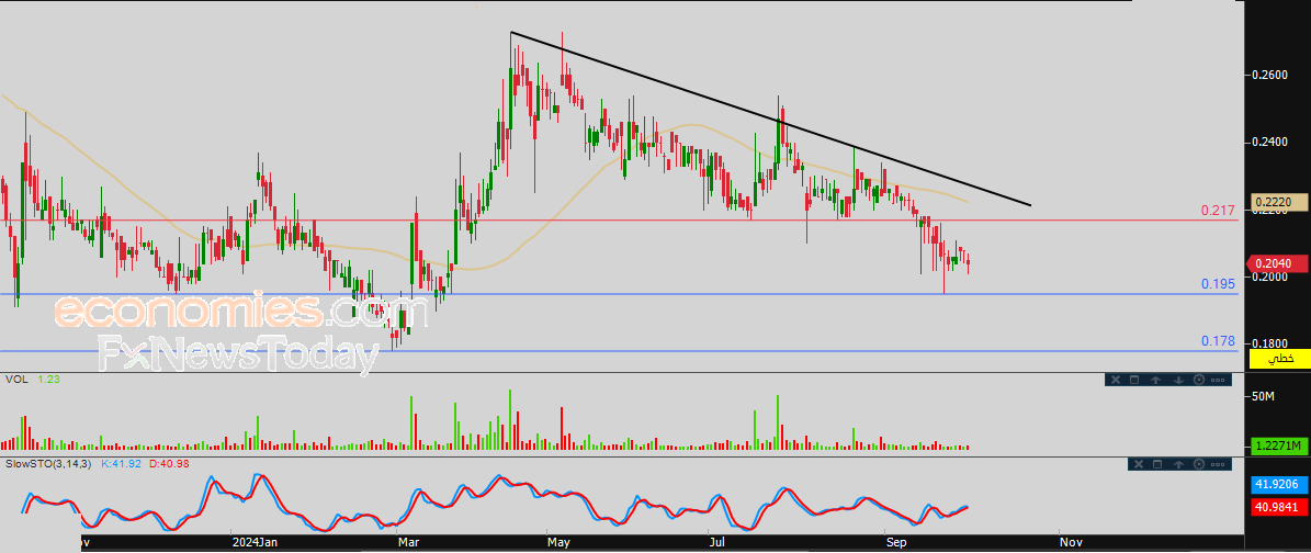 لهذا تشير توقعاتنا إلى المزيد من الهبوط لسعر السهم خلال تداولاته القادمة، طيلة ثبات مستوى المقاومة 0.217، ليستهدف أولى مستويات الدعم عند 0.195.