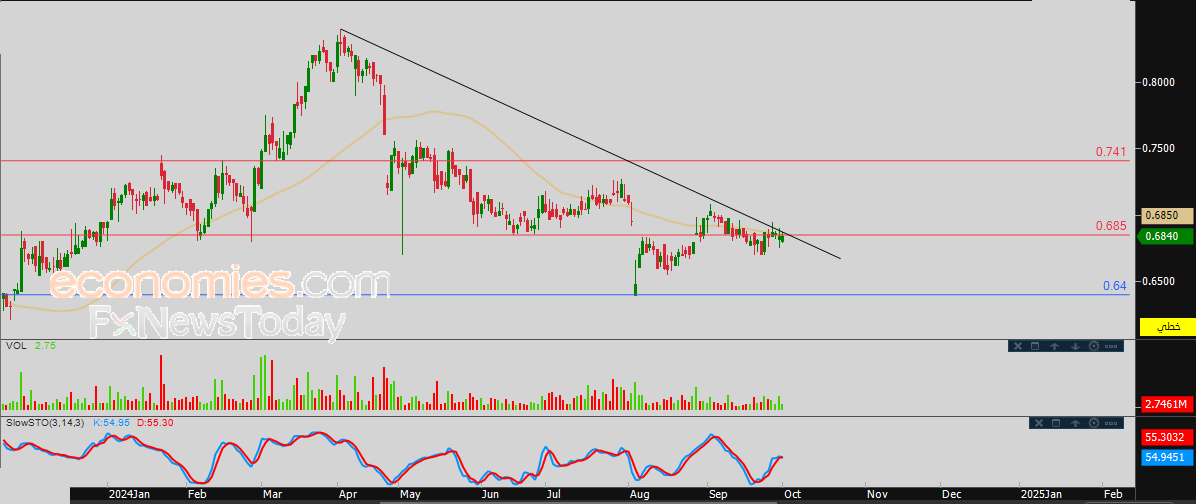 لذلك نحن نتوقع انخفاض سعر السهم خلال تداولاته القادمة، طيلة ثبات مستوى المقاومة 0.685، ليستهدف مستوى الدعم 0.64.