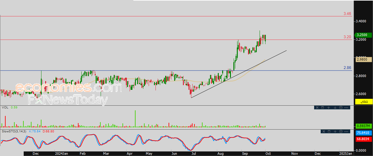 لهذا تشير توقعاتنا إلى المزيد من الصعود لسعر السهم خلال تداولاته القادمة، خاصة طيلة استقراره أعلى مستوى 3.20، ليستهدف مستوى المقاومة 3.45.