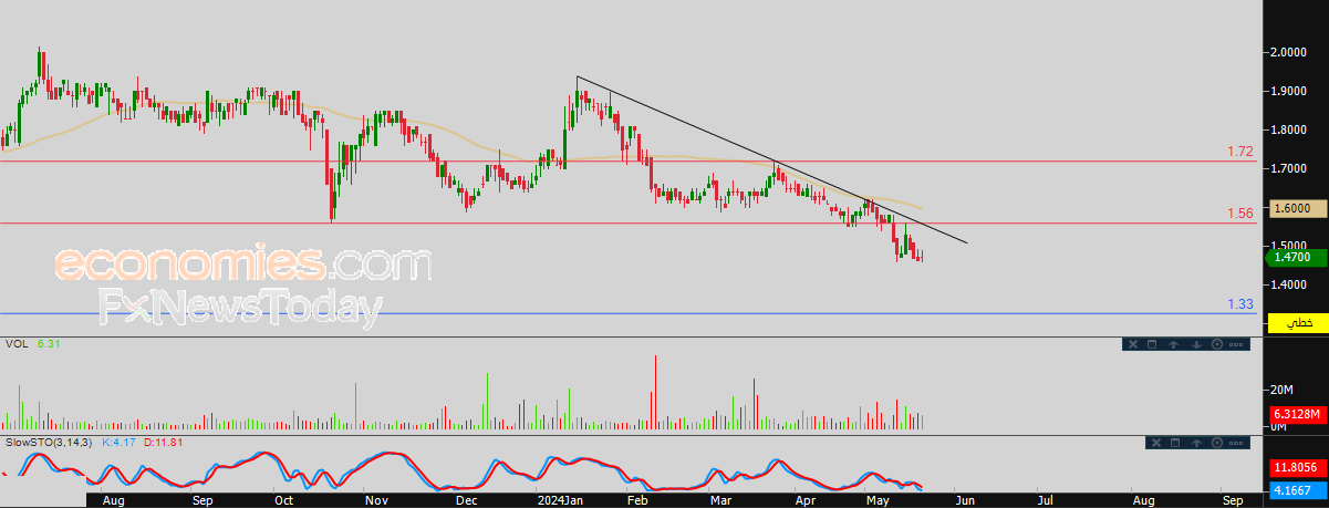 لذلك نحن نرجح عودة هبوط سعر السهم خلال تداولاته القادمة، طيلة استقراره دون مستوى 1.56، ليستهدف مستوى الدعم 1.33.