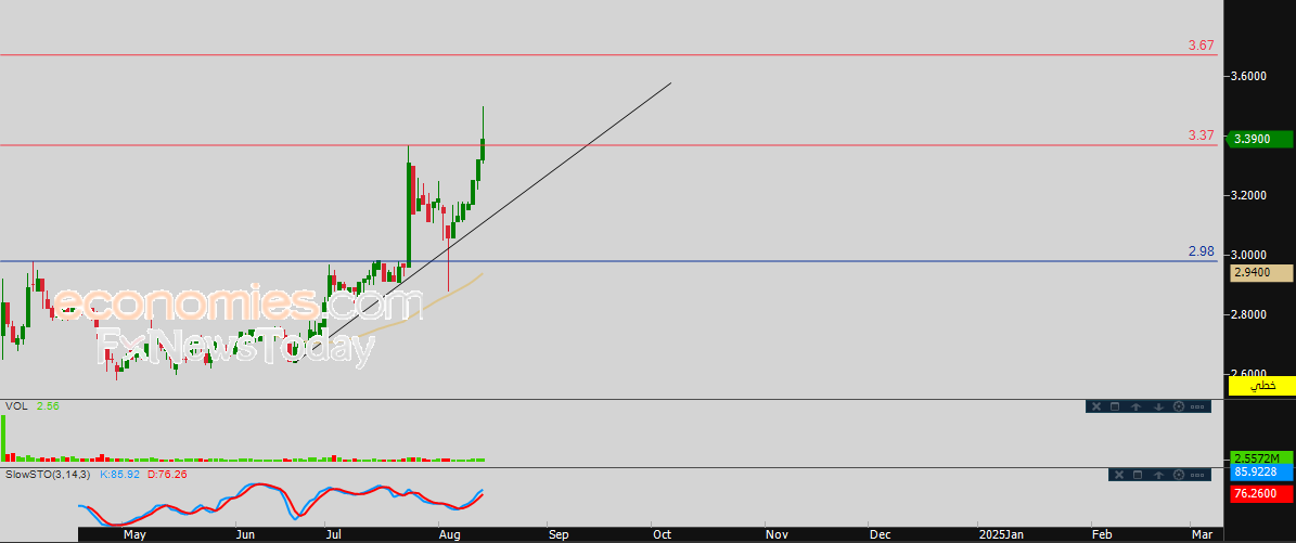 لهذا تشير توقعاتنا إلى استمرار صعود سعر السهم خلال تداولاته القادمة، خاصة في حالة تأكيد اختراقه للمقاومة 3.37، ليستهدف مستوى المقاومة 3.67.