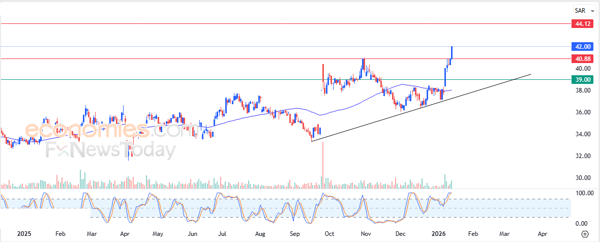 لذلك فتوقعاتنا تشير إلى صعود سعر السهم خلال تداولاته القادمة، خاصة طيلة استقراره أعلى سعر 40.85 ريال، ليستهدف مقاومته التالية عند سعر 44.00 ريال.
