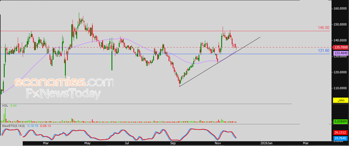لهذا تشير توقعاتنا إلى صعود سعر السهم خلال تداولاته القادمة، طيلة ثبات مستوى الدعم 131.60 ريال، ليستهدف مستوى المقاومة المحوري 146.00 ريال.
