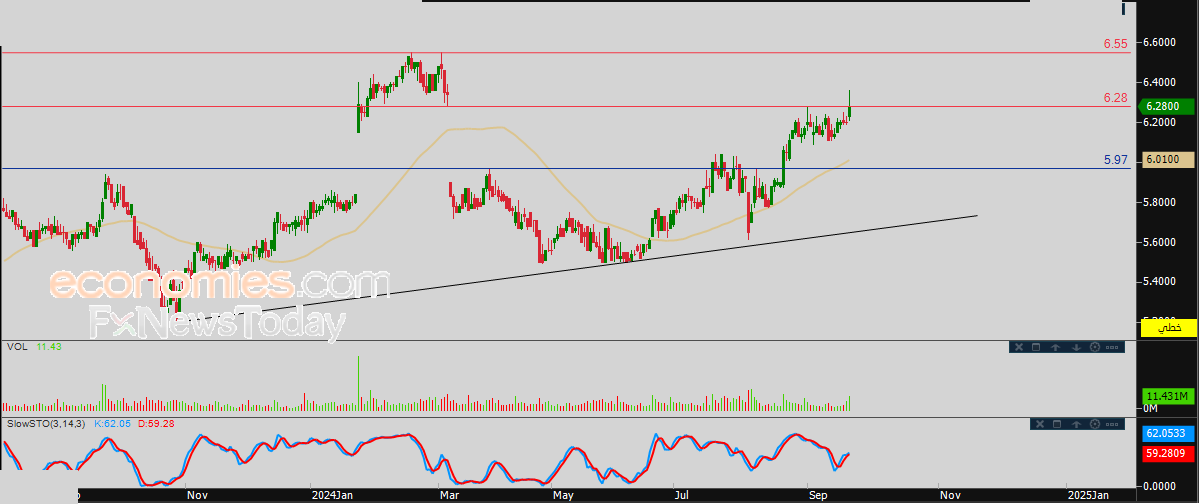 لهذا تشير توقعاتنا إلى المزيد من الصعود لسعر السهم خلال تداولاته القادمة، خاصة في حالة اختراقه للمقاومة الحالية 6.28، ليستهدف بعدها مستوى المقاومة المحوري 6.55.