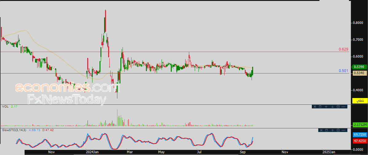 لهذا تشير توقعاتنا إلى المزيد من الصعود لسعر السهم خلال تداولاته القادمة، طيلة ثبات مستوى الدعم 0.500، ليستهدف مستوى المقاومة 0.630 الذي يمثل الحدث العلوى من تلك المنطقة العرضية.