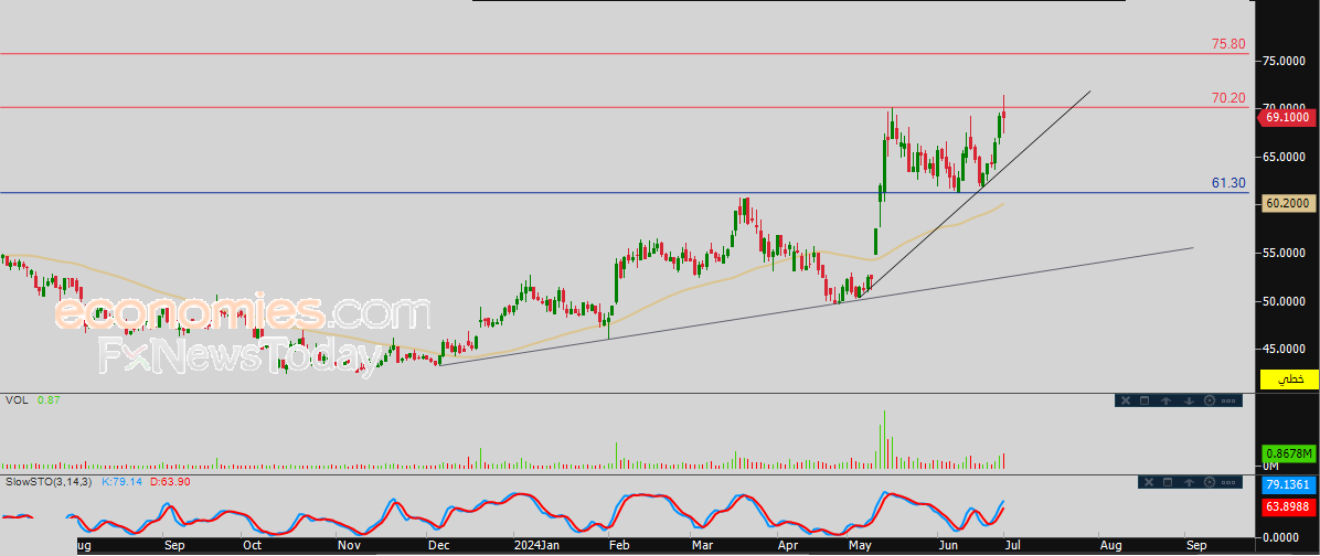 لهذا نحن نرجح عودة ارتفاع سعر السهم خلال تداولاته القادمة، خاصة في حالة اختراقه للمقاومة سابقة الذكر 70.20، ليستهدف بعدها مستوى المقاومة 75.80.